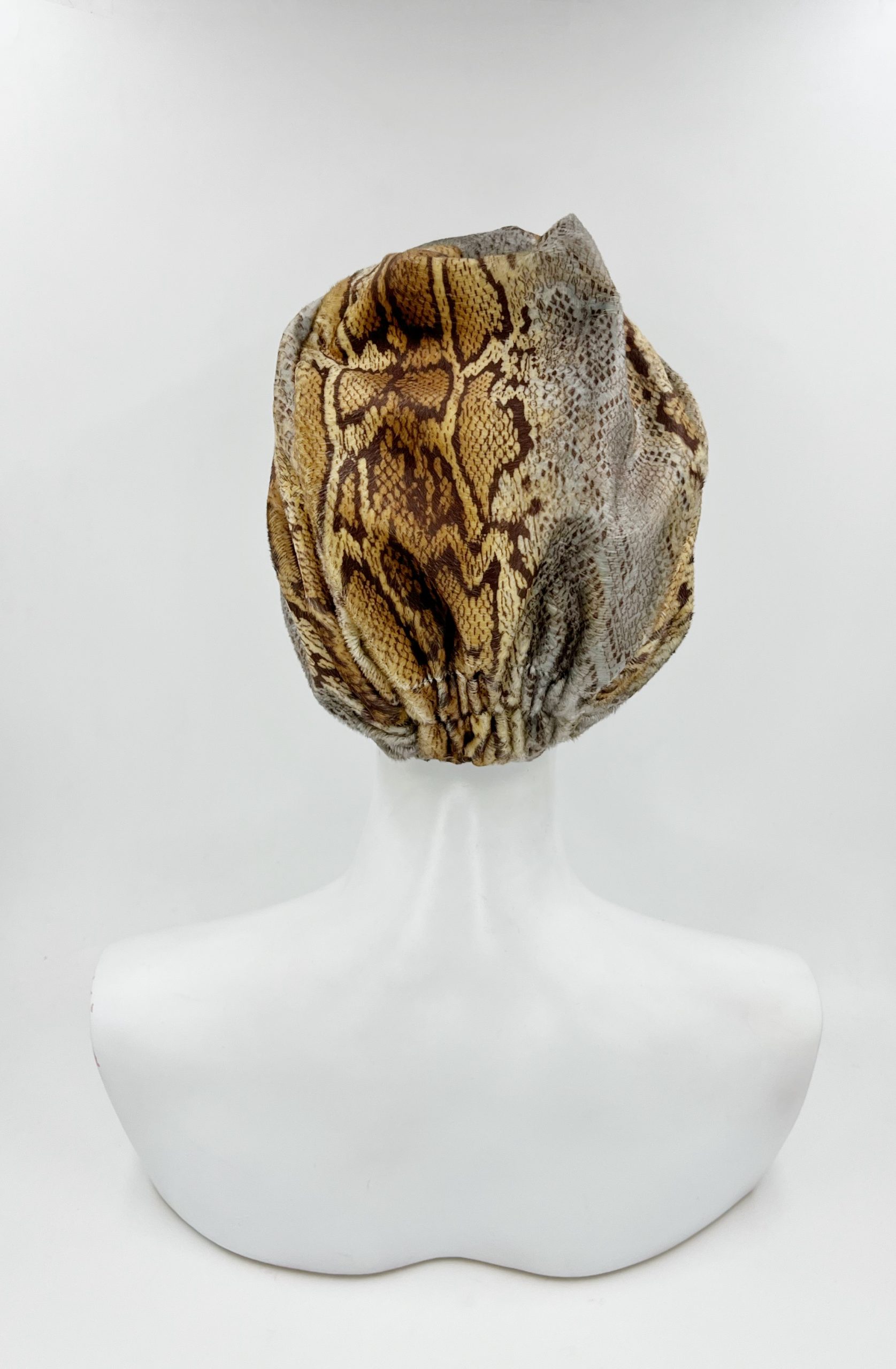 Questo turbante Agata, in una lana effetto cavallino che imita la pelle di un serpente, ne è la riprova.